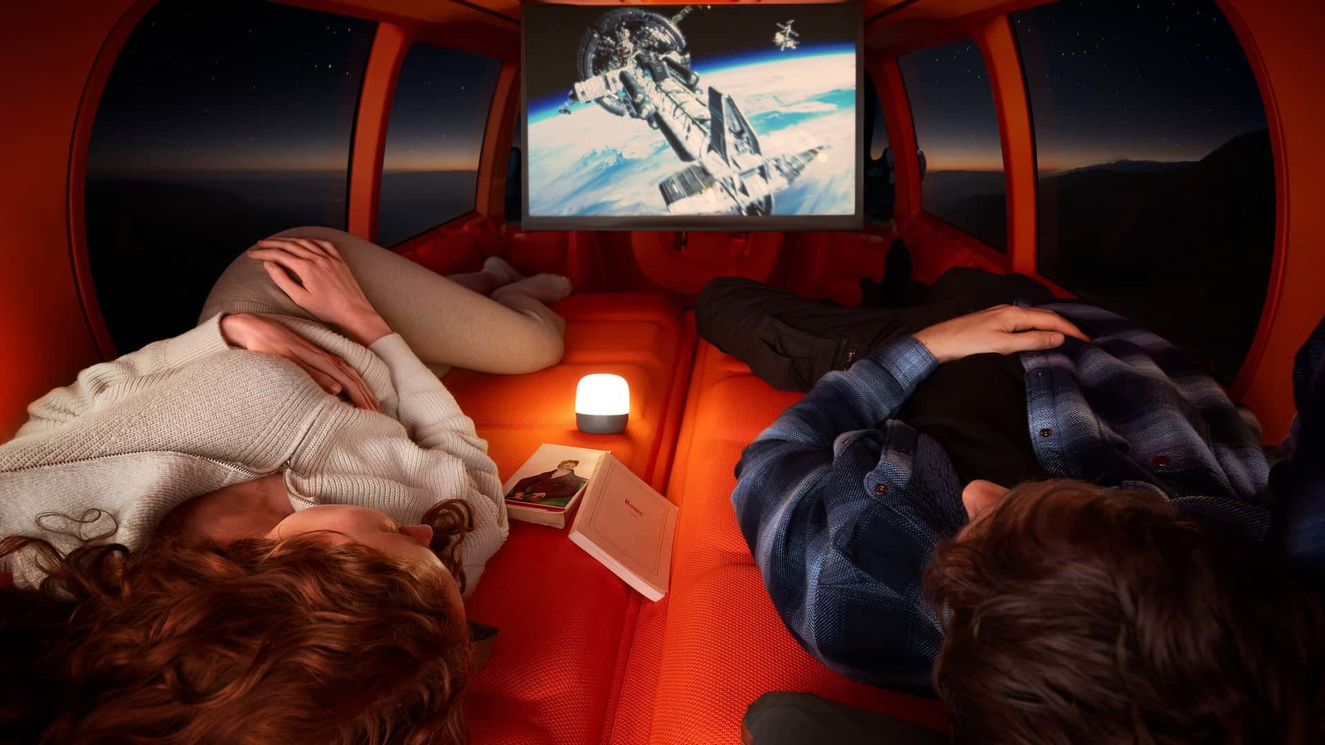 Električni monovolumen može se pretvoriti i u kućno kino, zahvaljujući preklopnom zaslonu koji se spušta iz krova.