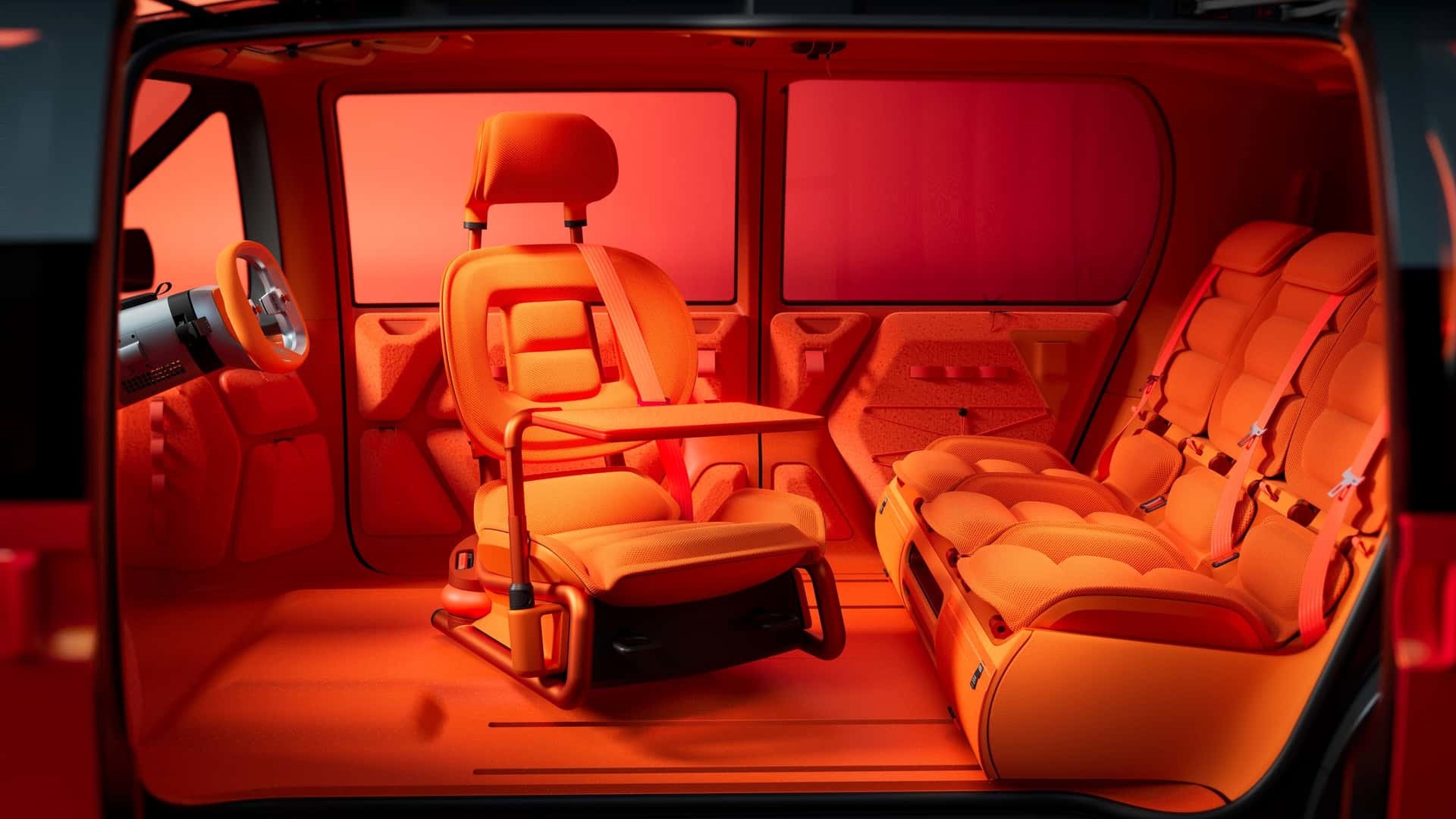 Unutrašnjost je osmišljena kao fleksibilan prostor koji može primiti do čak šest osoba. Koncept sjedenja je pritom potpuno nekonvencionalan. Vozač sjedi u sredini, a dva pomična sjedala nalaze se dijagonalno iza njega. Stražnju klupu čini monolitna klupa za troje.