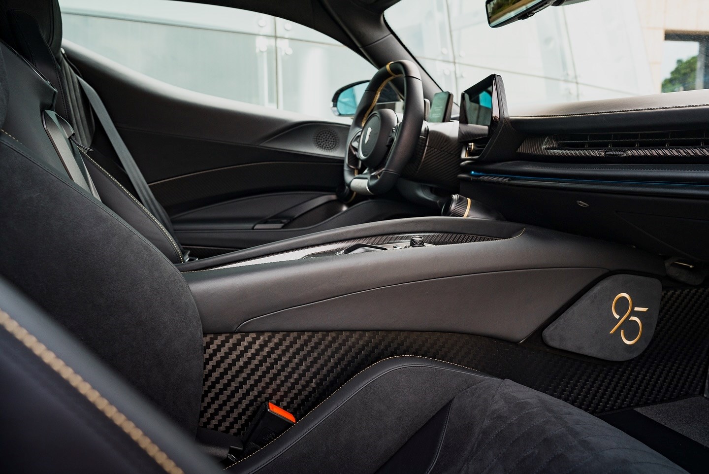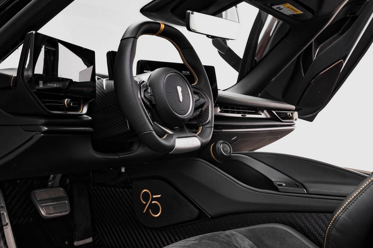 I unutrašnjost obiluje posebnim detaljima. Sjedala su presvučena kombinacijom crne kože i crne alcantare, sa zlatnim i crnim prošivima. Na podstavama za koljena nalazi se logotip '95' u zlatnoj boji, a tu su i brojni detalji od posebno obrađenog karbona i aluminija, uz više elemenata anodiziranih u zlatnu i crnu boju.