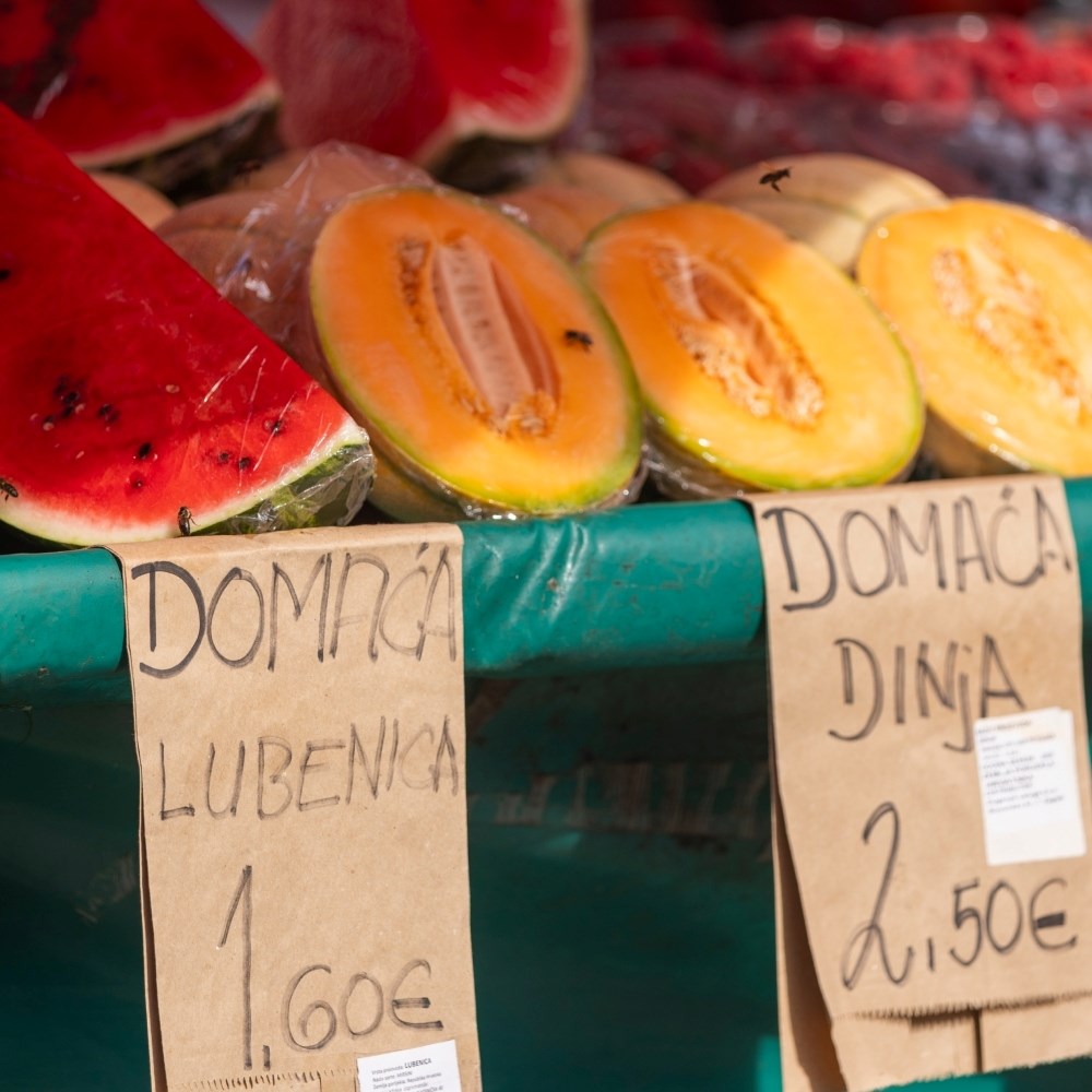 Smokve se prodaju za 10 eura po kilogramu ili 5 eura za 500 g, a osim smokava, na Dolcu smo pronašli i lubenice, bez kojih ne možemo zamisliti ljeto. One koštaju između 1 i 1.60 eura za kilogram. Tu su i dinje, koje se prodaju za 2 do 2.50 eura po komadu, i marelice, koje koštaju 5 eura.