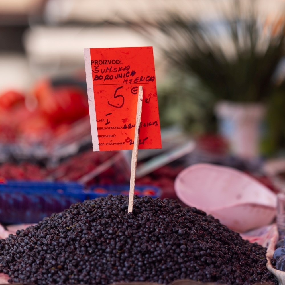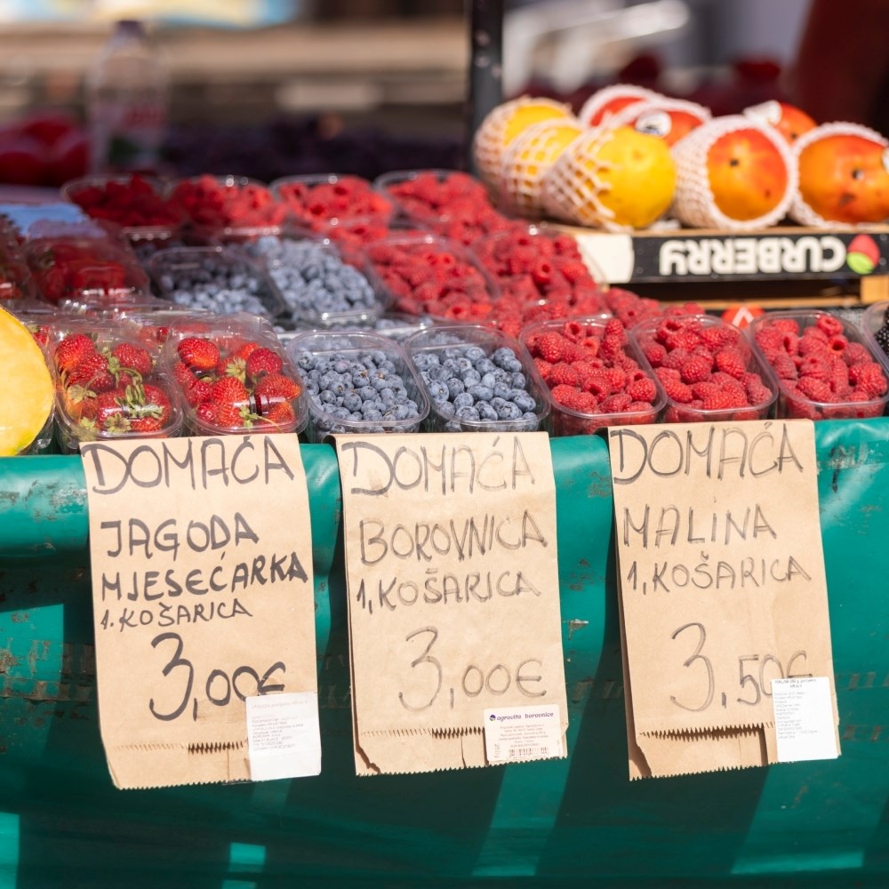 Jagode, borovnice i maline prodaju se po košarici od 500 grama - cijena jagoda i borovnica je 3 eura po košarici, a maline koštaju 3.50 eura. Na drugom smo štandu šumske borovnice pronašli po cijeni od 5 eura za mjericu.
