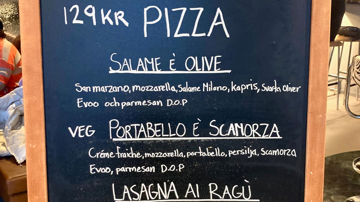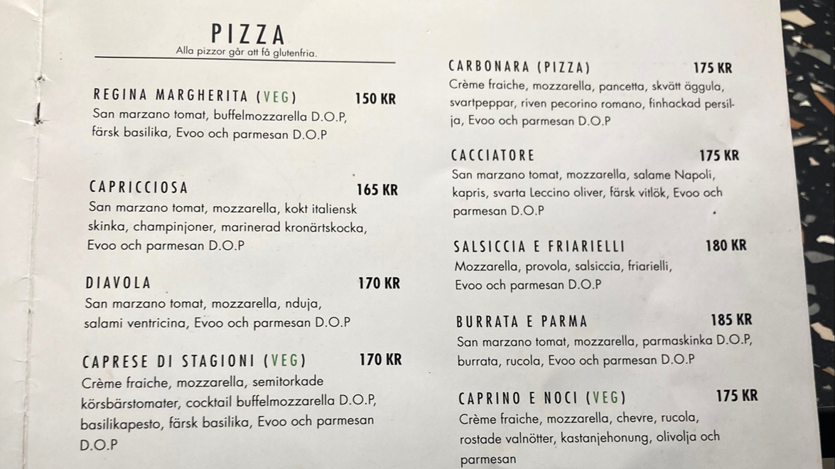 Cijene pizza u krunama su iste, ali izražene u eurima su dosta niže nego u Danskoj budući da je švedska kruna slabija od danske. Marinara je najjeftinija i košta 140 švedskih kruna (13 eura), Margherita je 150 švedskih kruna (14 eura), a najskuplje su upravo dvije koje smo naručili i koje koštaju 185 švedskih kruna (17.50 eura). Dječje su pizze 12 eura.