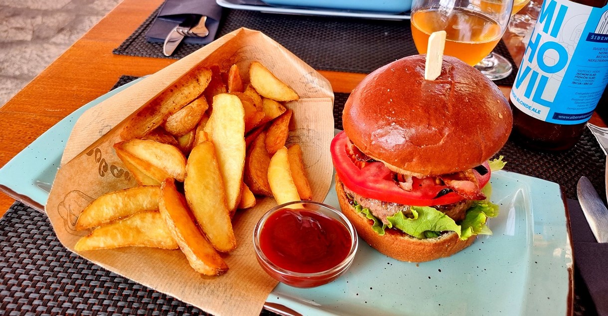 Neki će sada reći - OMG, pa tko jede burger na moru? Eto, jedemo, pogotovo jer smo prije toga pojeli najlošiju pašticadu u životu. S obzirom na to da ih i inače dosta jedemo i vrlo su često složeni s prepečenim i/ili gumenastim mesom, ovaj je burger bio jako dobar, kao i mekano brioche pecivo koje se ne raspada. Uz to smo popili šibensko pivo Mihovil koje je ok.