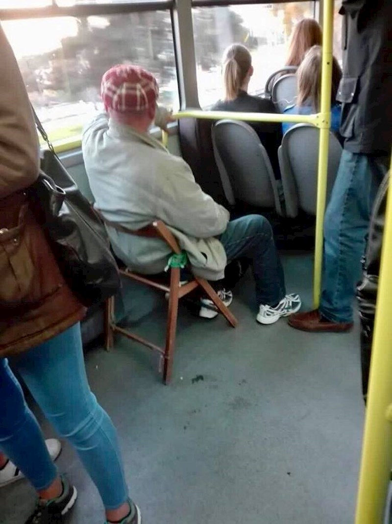 Ovaj stariji muškarac je vjerojatno često imao problem s pronalaskom slobodnog mjesta u gradskom autobusu. Ni mlađi ljudi ponekad ne žele ponuditi svoje mjesto pa se snašao i smislio rješenje. :)