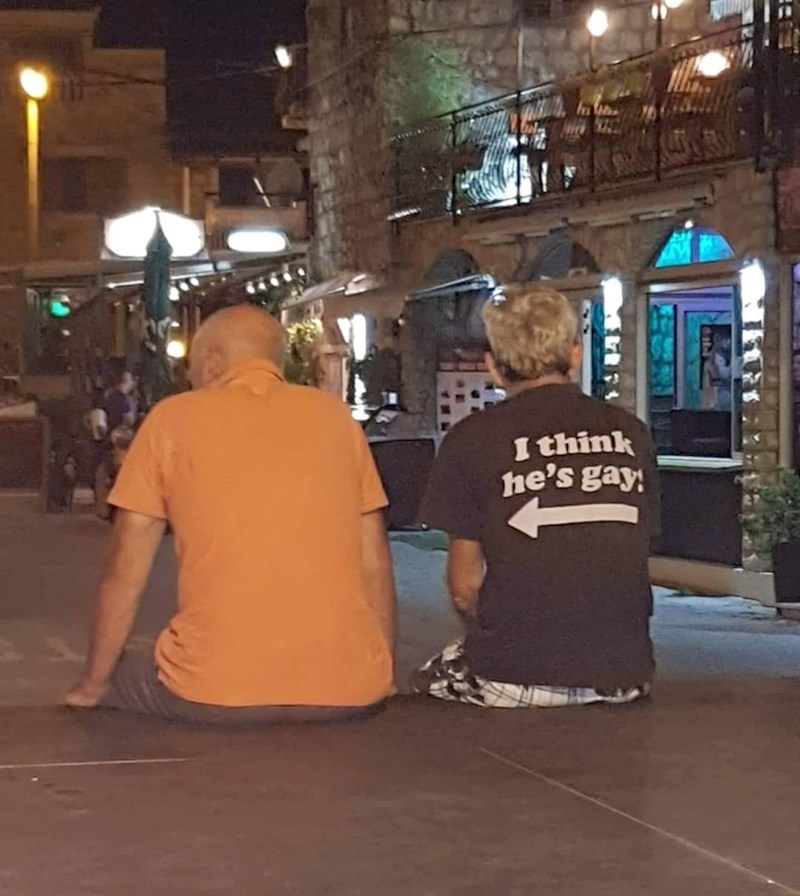 Netko je u Marini slikao dvojicu muškaraca, vjerojatno prijatelja, koji su nasmijali prolaznike. Sjedili su, jedan od njih je imao natpis na majici, a drugi nije imao pojma što mu se događa iza leđa... :-)