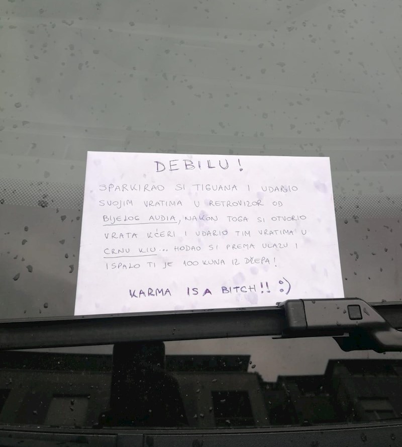 Sa zagrebačkog Črnomerca nam stiže genijalna poruka koju je netko ostavio jednom bezobzirnom vozaču. Dok je parkirao svoje vozilo i izlazio iz njega, udarao je tuđe automobile, no na kraju nije primijetio da se i njemu dogodilo nešto loše...