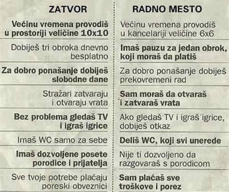 Koliko god to žalosno zvuči, postoje ljudi koji imaju osjećaj da bi im u zatvoru bilo bolje nego na poslu. Ova usporedba će vas potaknuti na razmišljanje.