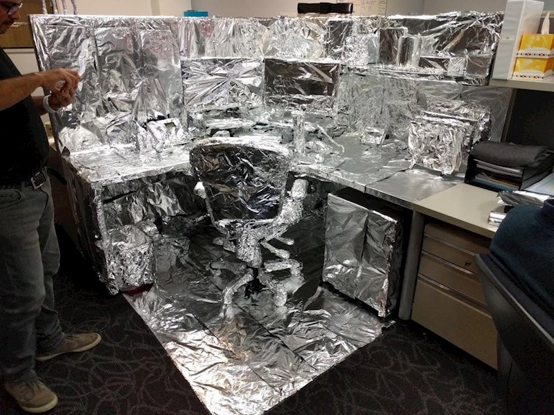 Kada se vratio sa godišnjeg odmora koji je trajao dva tjedna dočekala ga je ova scena. Kolege su se ispričali i rekli da su samo pokušavali očuvati njegove stvari od prašine. :)