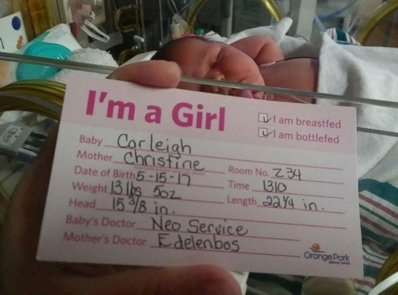 Doktori su uspješno obavili carski rez, a beba koju su tada imali priliku vidjeti, ostat će im još dugo u sjećanju. Djevojčica Carleigh je imala čak 6.05 kg, što je puno više od uobičajene težine novorođenčadi. Doktori su rekli da je Carleigh bila gotovo duplo veća od ostalih novorođenih beba. "Kad su je doktori izvukli van, čula sam kako su se svi odjednom počeli smijati. Nakon toga sam vidjela da je ogromna.", ispričala je Chrissy.