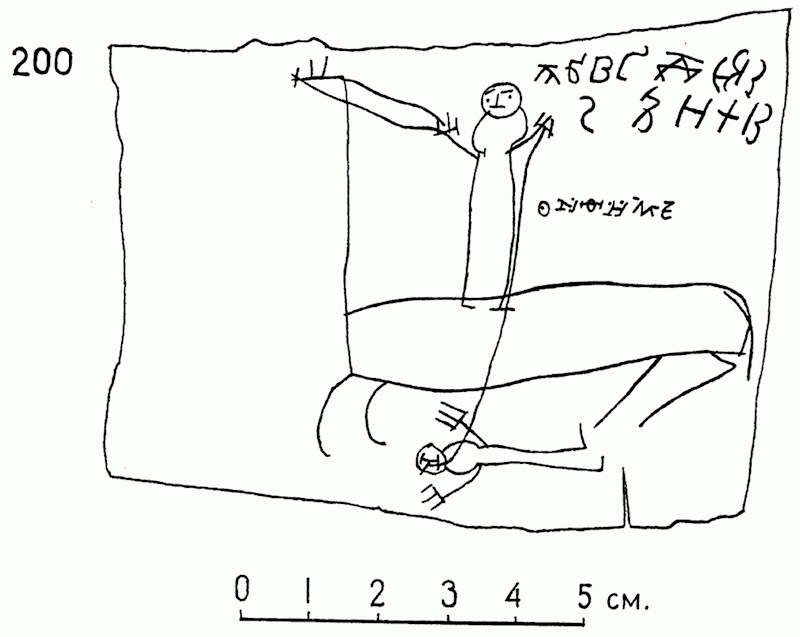 Ovdje se vidi kako je krenuo kopirati slova u abecedi, a onda mu je to dosadilo pa je nacrtao sebe kao ratnika na konju i oružjem u rukama.