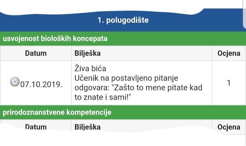 Zbog ovog odgovora je učeniku dala ocjenu 1.