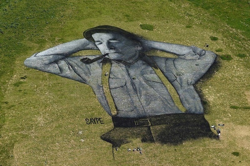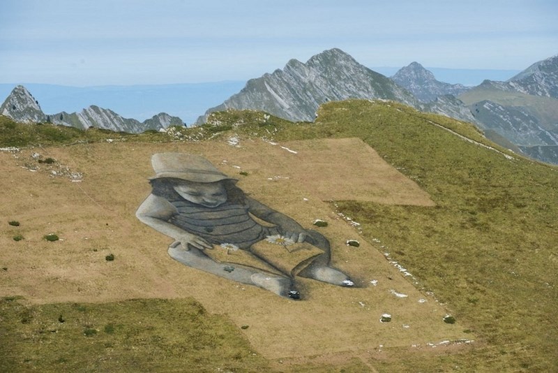 Umjetnik pod imenom Guillame Legros, poznatiji kao Saype, stvara nevjerojatno velike radove. Ovo su zapravo grafiti kojima se on inače i bavi, a koristi biološki razgradivu boju koju sam priprema korištenjem lanenog ulja, vode i brašna - mješanim sa prirodnim pigmentima. Boja u prosjeku traje samo mjesec dana, ovisno o vanjskim faktorima poput kiše.
