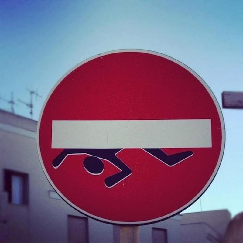 Koristio se ljepljivim trakama i trudio da ne uništi početno značenje znaka kako bi se sudionici u prometu i dalje mogli osjećati sigurno. Bez obzira na to što se trudio održati znak prepoznatljivim već je jednom dobio kaznu od 400 eura za vandalizam. Pogledajte kako neki od njih izgledaju. :)