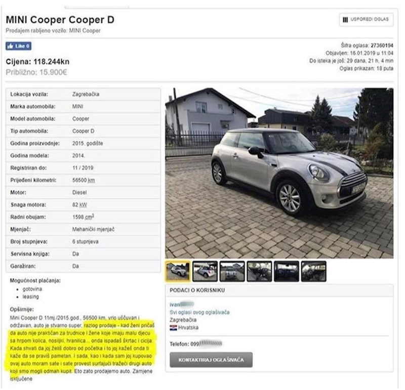 "Razlog prodaje - kad ženi pričaš da auto nije praktičan za trudnice i žene koje imaju malu djecu sa hrpom kolica, nosiljki, hranilica... onda ispadaš škrtac i cicija. Kada shvati da joj želiš dobro od početka i to joj kažeš onda ti kaže da se praviš pametan. I sada, kao i kada sam joj kupovao ovaj auto moram sate i sate provest surfajući tražeći drugi auto koji smo mogli odmah kupit. Eto zato prodajem auto." :)