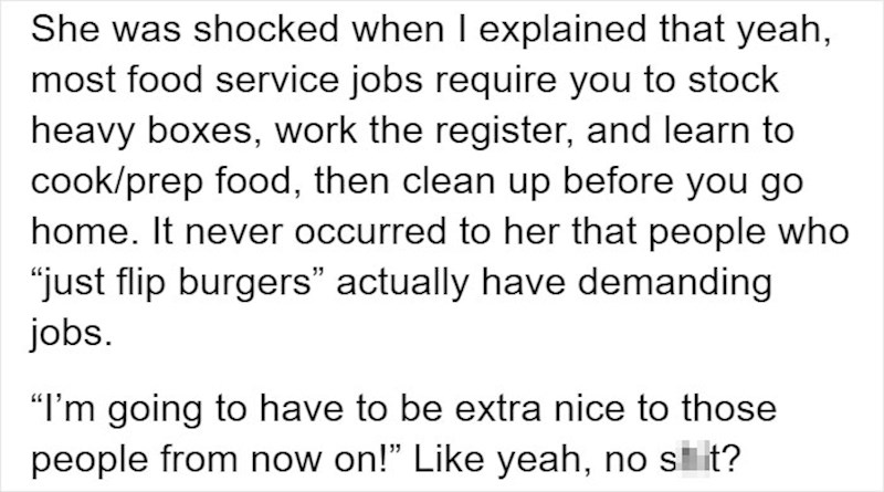 "Također je bila u šoku kada sam joj objasnila da je većina takvih poslova teška, nosiš teške kutije, radiš na blagajni, pripremaš hranu i sve čistiš poslije."
