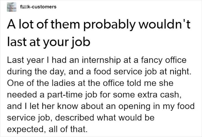 Internetska stranica Tumblr objavila je ovu priču o osobi koja radi uredski posao, ali je trebala dodatan novac i zaposlila se u restoranu.