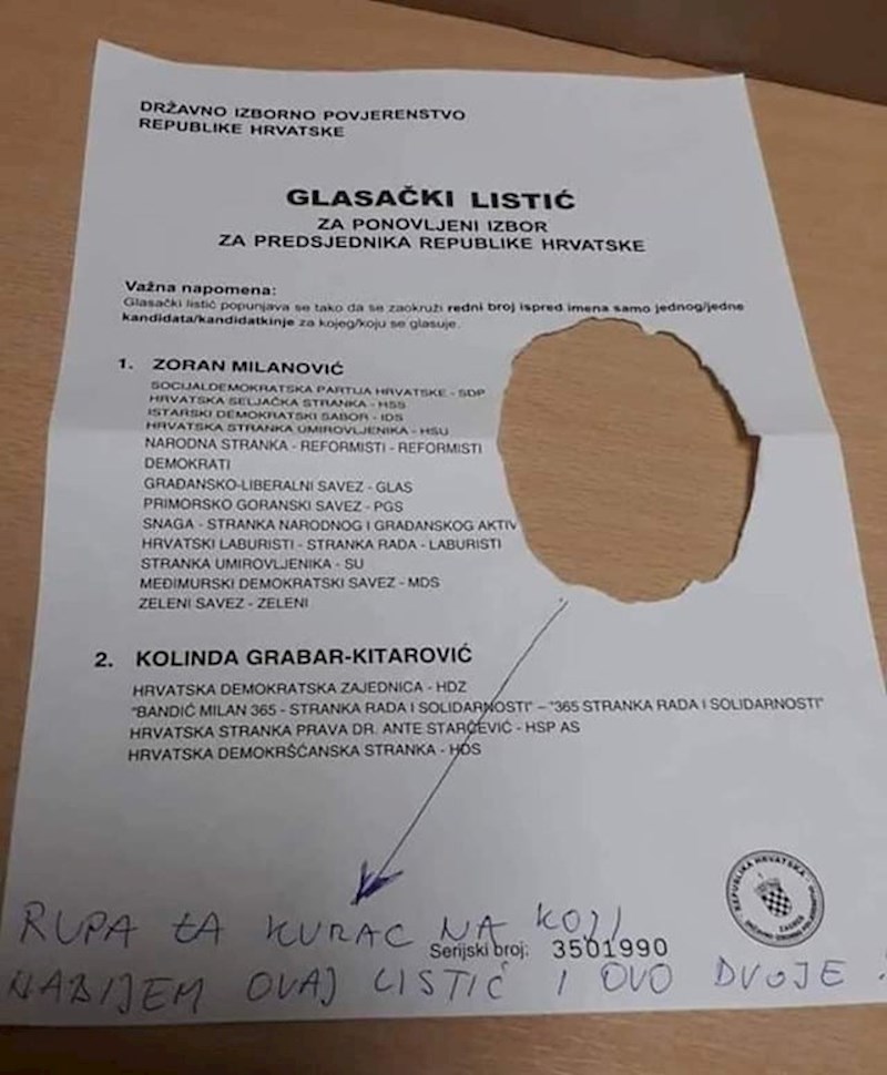 Kao i nakon svakih izbora, na društvenim mrežama su se pojavile slike najzanimljivijih i najčudnijih nevažećih listića. I ovaj put ih je bilo dovoljno, a jedan od nepristojniji je bio listić koji ćete vidjeti u nastavku.
