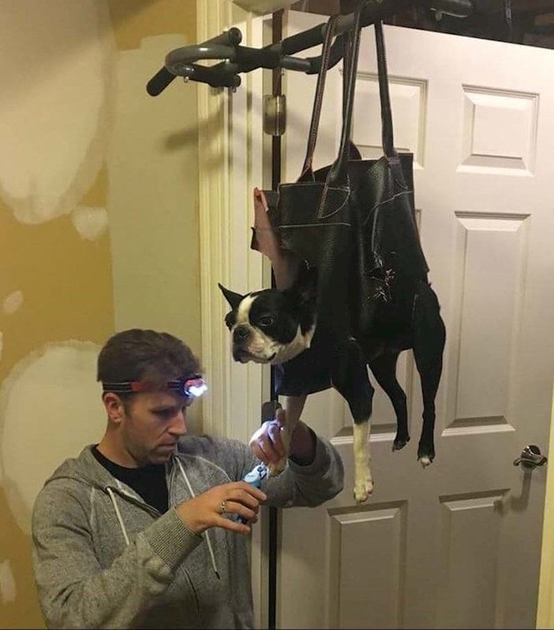 Jedna cura na internetu je podijelila ovu sliku svog tate i psa. Pas se boji rezati nokte i bježi, pa je tati palo na pamet kupiti žensku torbicu, probušiti rupe za noge i staviti ga unutra.