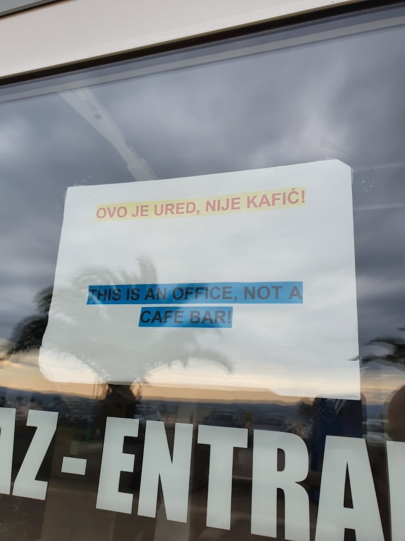 Ovaj Dalmatinac je imao ozbiljan problem. Ljudi su iz nekog razloga cijelo vrijeme mislili da je njegov ured zapravo kafić pa je morao stvari nekako razjasniti. Na ulaznim vratima svog ureda zalijepio je obavijest nakon koje je sve bilo jasno. :)