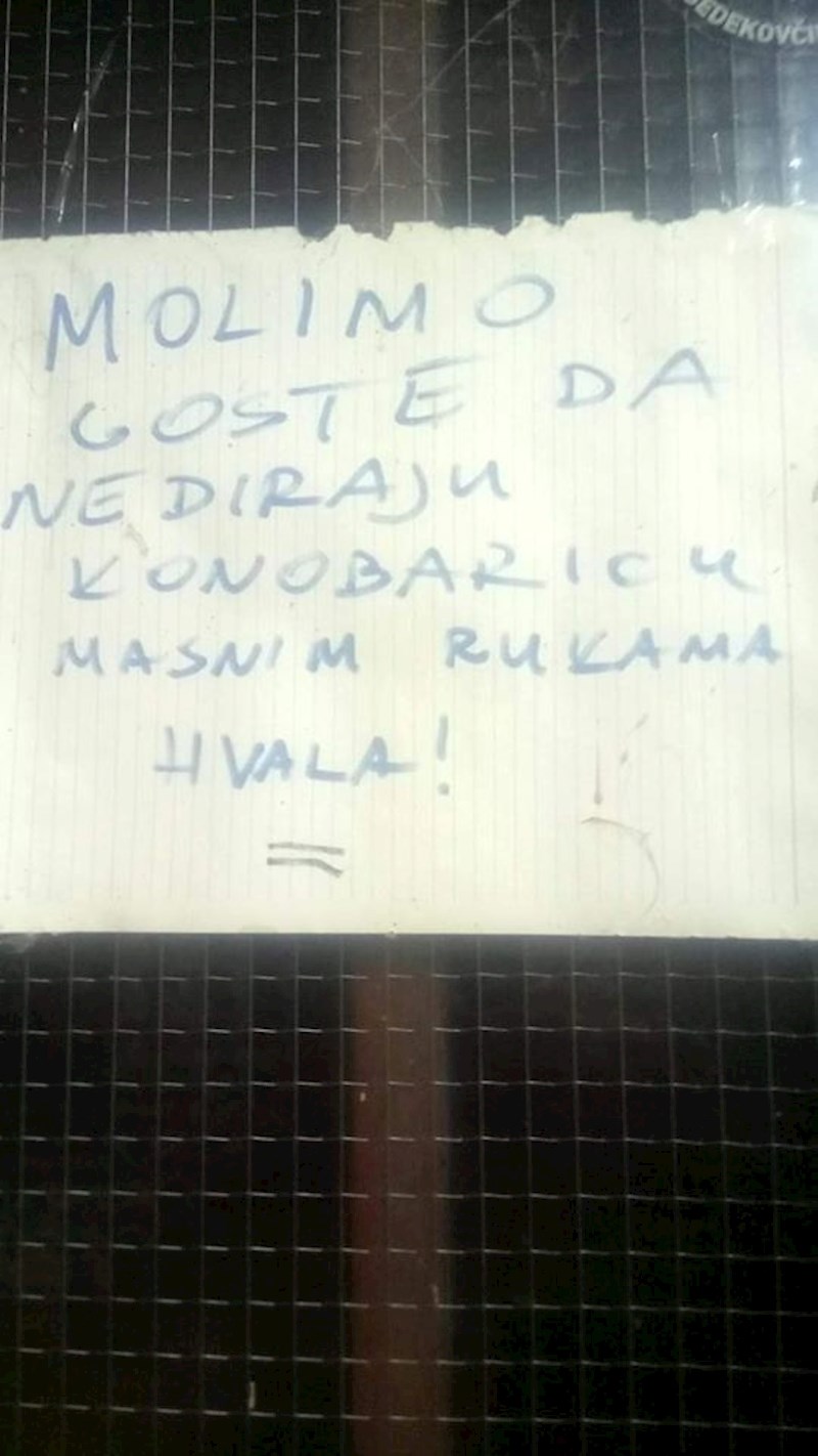 Nije konobaricama lako, ne samo zbog neprimjerenog ponašanja nekih gostiju, nego očito i zbog masnih prstiju zbog kojih se stalno isprljaju. U ovom restoranu to više nisu mogli trpjeti pa su reagirali ovom neobičnom zamolbom. :)