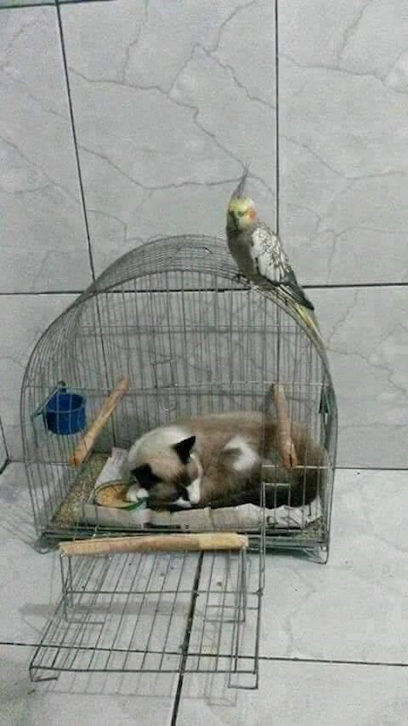 Vlasnici su pustili ovu papigu nimfu da malo proleti stanom, a to je vrijeme jedna znatiželjna gošća iskoristila kako bi isprobala kako je njezinoj životinjskoj cimerici u njezinoj "sobi". I čini se da joj se svidjelo. :)