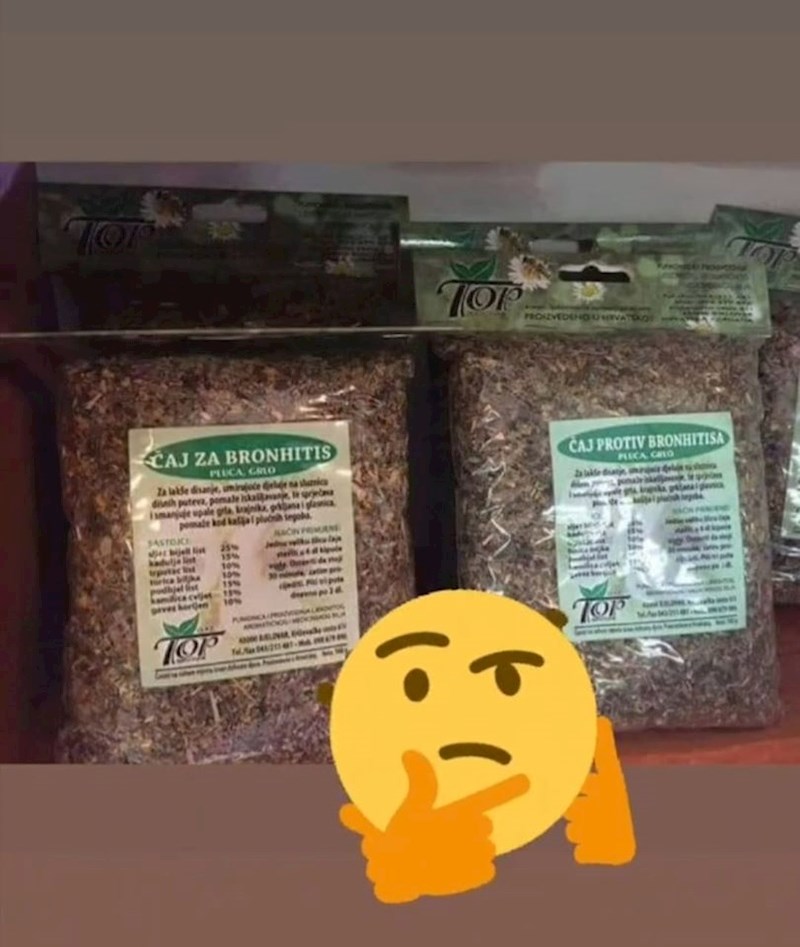Vidimo zbog čega je ova osoba bila zbunjena kad je u dućanu došla do odjela s čajevima i vidjela ovo. "Čaj protiv bronhitisa" zvuči sasvim normalno, ali ovo lijevo? Hm... :)