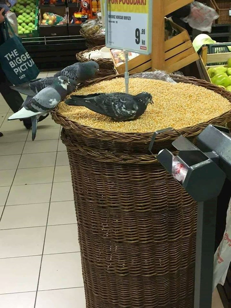 Kupce u ovom supermarketu zbunio je neobičan prizor na odjelu voća i povrća. Nekoliko golubova uspjelo se prokrijumčariti u trgovinu i nije im trebalo puno vremena da sebi nađu idealno mjesto za ručak.
