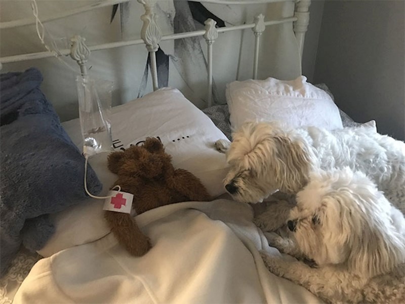 Na kraju su bili zadovoljni i psi koji su zabrinuto gledali kako plišani medo leži na "bolničkom krevetu" i prima infuziju.