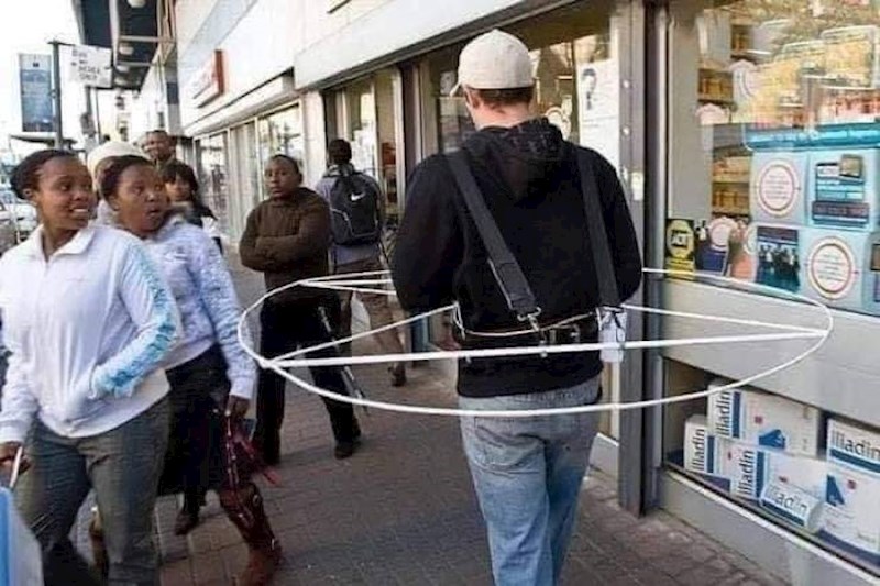No ovaj pojedinac ostavlja dojam kao da je jedva čekao priliku da isproba ovaj obruč koji bi mu trebao osigurati dovoljno osobnog prostora i sigurnu distancu od potencijalno zaraženih osoba koje prolaze pored njega.