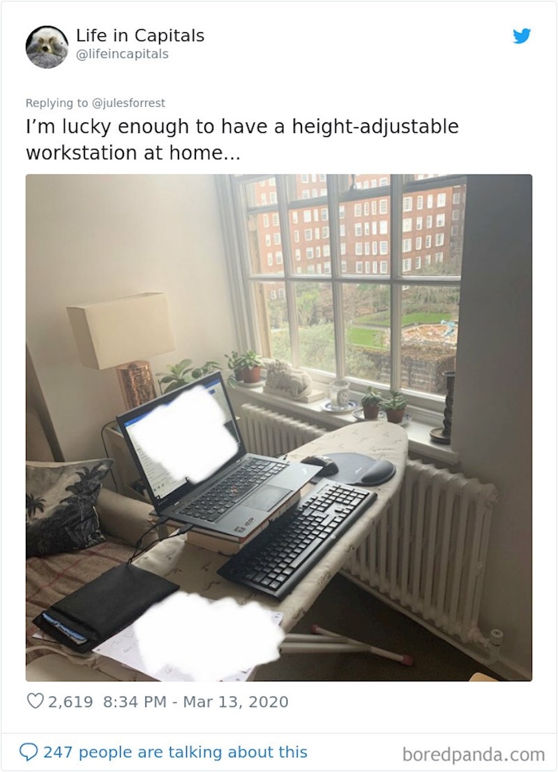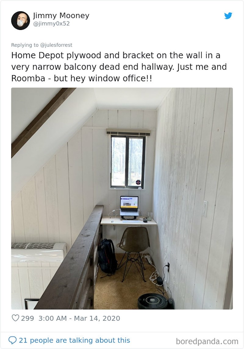 Zbog toga je Jules Forrest na Twitteru objavila sliku svog improviziranog ureda i zamolila ostale da isto to učine. Nije očekivala da će dobiti ovoliko odgovora, među njima ima zaista zanimljivih primjera. :)