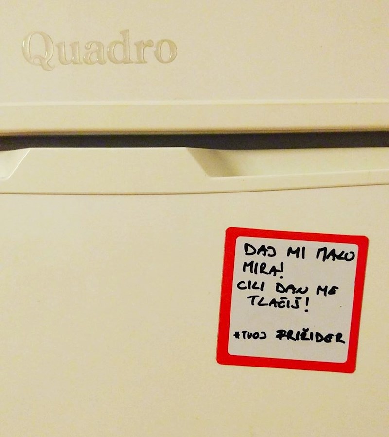 U ovoj izolaciji nije lako ni našim rashladnim uređajima. Po cijele dane ih otvaramo i zatvaramo, nadajući se da će se stvoriti nešto novo. Ovaj lik je od dosade samo jeo, pa mu je njegov hladnjak napisao poruku. :D