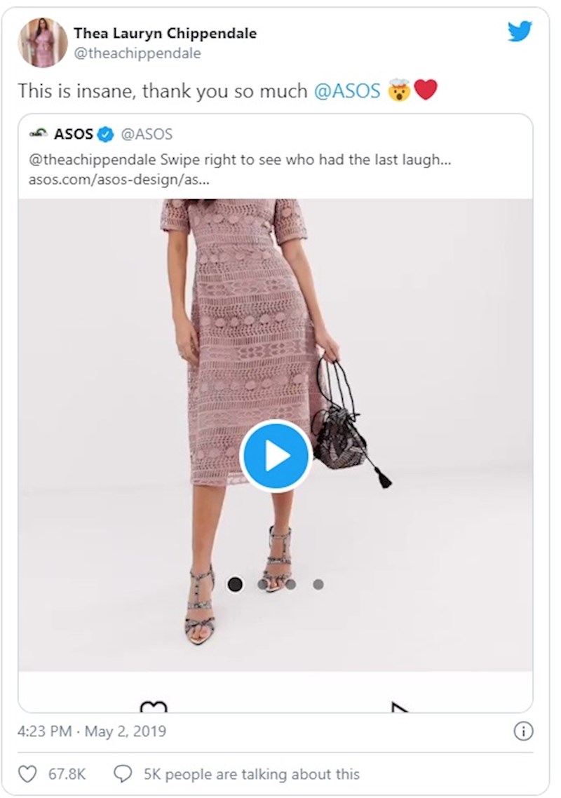 ASOS, na čijim je stranicama Thea kupila haljinu, reagirao je na njen Tweet. Napisali su joj da provjeri svoj sandučić s porukama