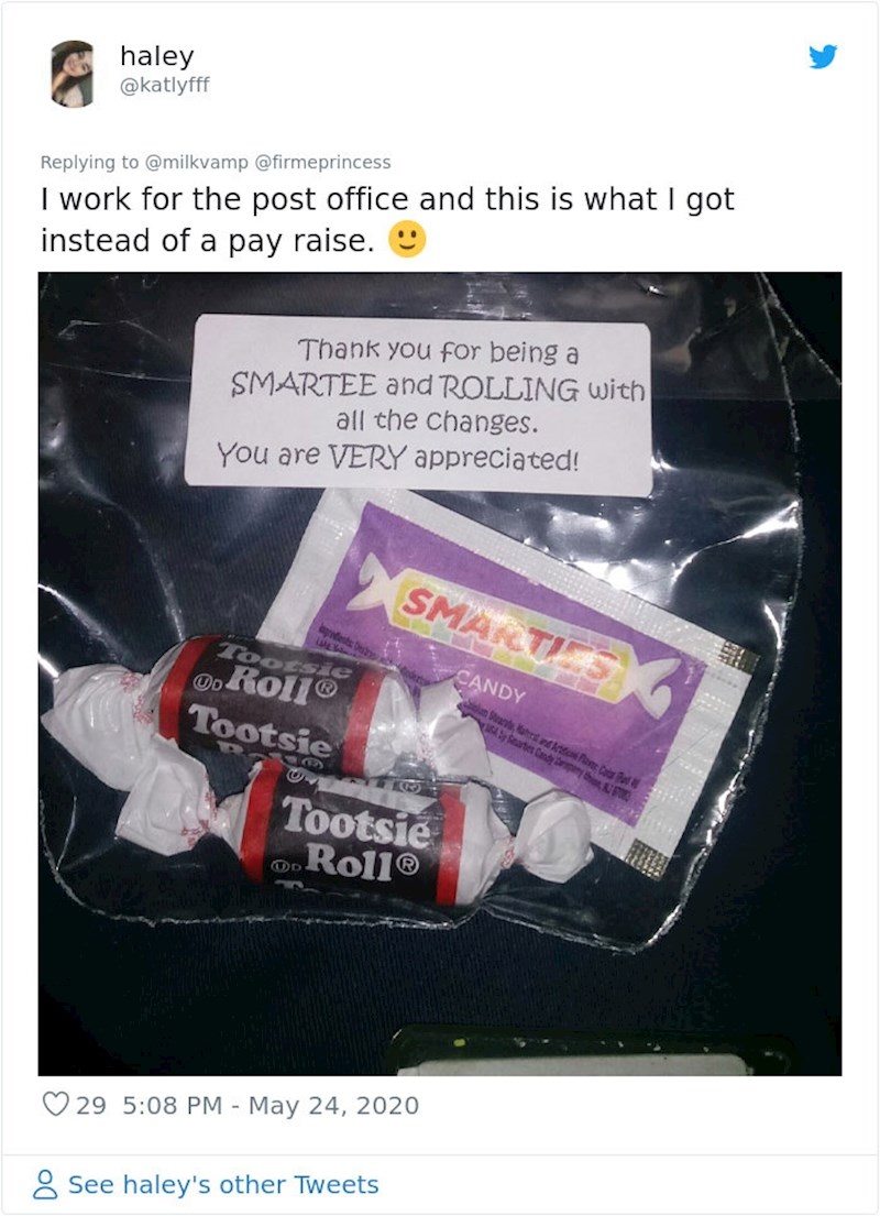 Zbog koronavirusa, mnogi od nas tek su sada shvatili koliko su zapravo potrebni zdravstveni radnici, trgovci, vozači kamiona i mnogi drugi. Neki od tih zaposlenika osjećaju ljutnju i nepravdu, jer iako su riskirali svoje zdravlje, osjećaju da ipak nisu dovoljno cijenjeni. Korisnik Twittera Milkvamp podijelio je "bonus" koji je njegov najbolji prijatelj dobio kao zaposlenik jednog dućana. Njegov post brzo je privukao veliku pozornost i potaknuo i druge ljude koji su se našli u sličnoj situaciji da objave slike svojih "velikodušnih" bonusa.