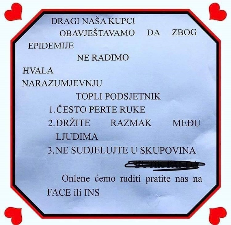 Potrudili su se i podsjetiti ljude na epidemiološke mjere kao što su pranje ruku, držanje razmaka, ukrasili su obavijest sa srcima, ali nažalost ništa nije pomoglo.... :D