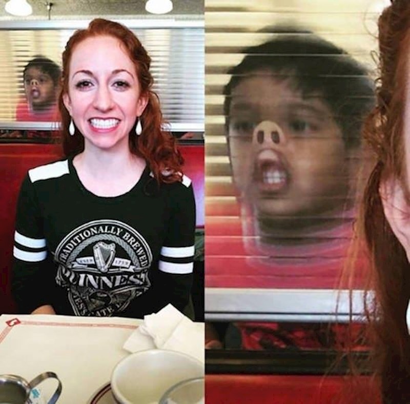 Cura i njen dragi izašli su na romantičnu večeru. Ona je u jednom trenu poželjela da ju fotografira. On je to i učinio, ali nije primijetio malog gosta u pozadini. Kada je kasnije primijetila dječaka na slici, nije se mogla prestati smijati. :D