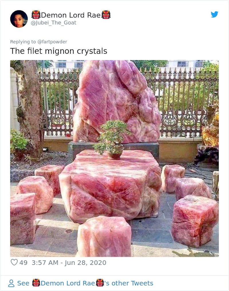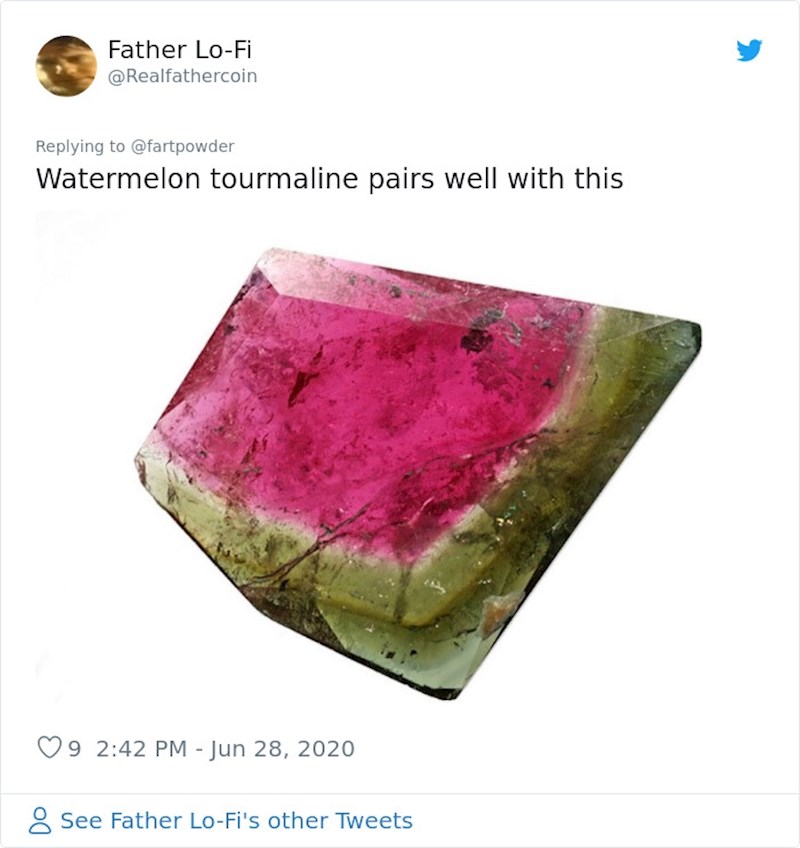 Ljepota kristala, ali i ljekovitost koja im se pripisuje, odavno oduševljavaju ljude. Ali, ovaj put je razlog malo drugačiji. Netko je na Twitteru objavio fotografiju kristala koji izgleda kao panirani komad mesa. Ubrzo se pokazalo da to nije jedini komad kristala koji izgleda kao da mu je mjesto u hladnjaku. Drugi korisnici Twittera počeli su objavljivati svoje kristale koji izgledaju poput kuhanog krumpira, voća, fileta ribe...