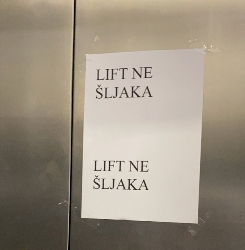 Dizalo se pokvarilo, pa je netko, valjda predstavnik stanara, odlučio obavijestiti ljude. Njegova poruka je jasna, ali izbor riječi mu je malo čudan. :D