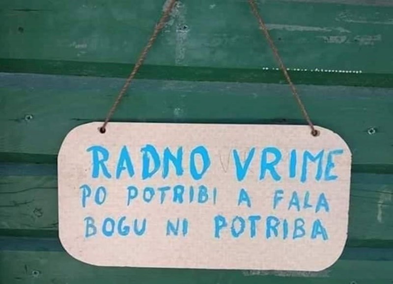 Svi mi bi barem malo skratili svoje radno vrijeme i o tome često maštamo. Neko to očito i mogu, kao što je ovaj lokal ili dućan u Dalmaciji. Simpatičan natpis nasmijao je sve posjetitelje i sigurno ih potaknuo da zavire i vide što se nudi kod ovih duhovitih Dalmatinaca. :)