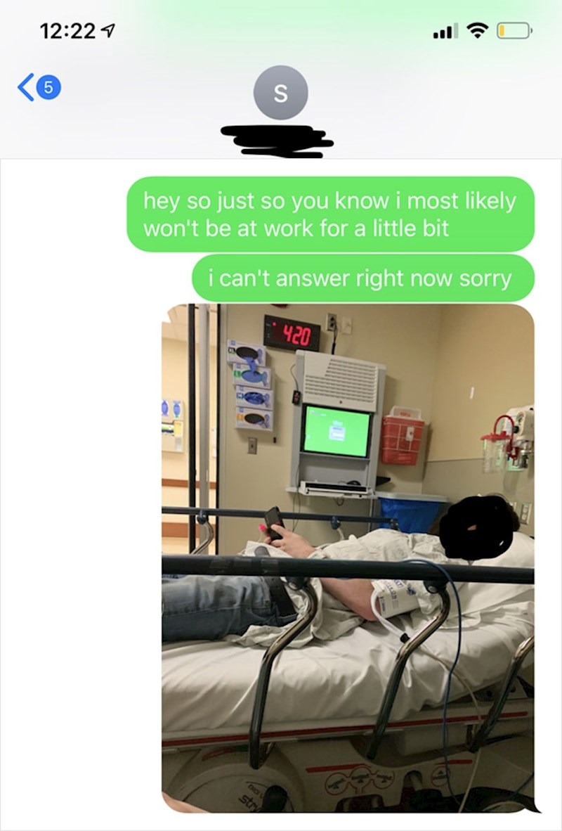 Išao je na operaciju i rekao joj da neće bar nekoliko dana moći doći na posao, čak joj se slikao u bolničkom krevetu. Umjesto poruke "Želim ti brz oporavak!" dobio je otkaz. Morao je odraditi još jedan kratki period do kraja ugovora, a to je iskoristio kako bi se osvetio bezobraznoj šefici. Slikao je što se zapravo događalo u restoranu te slike odlučio podijeliti na internetu.