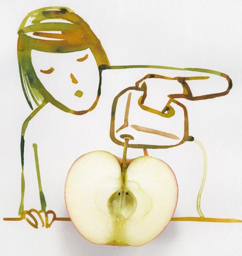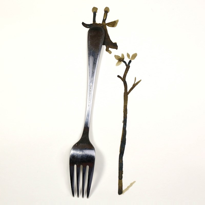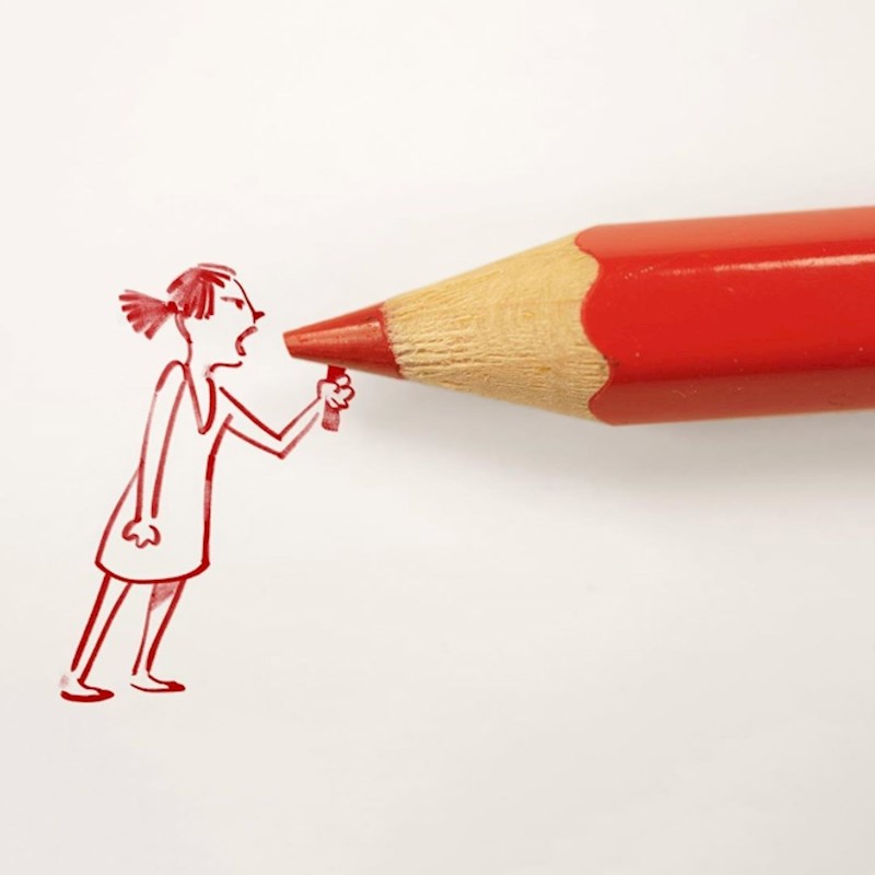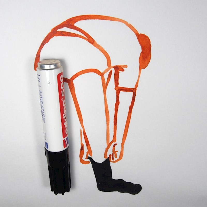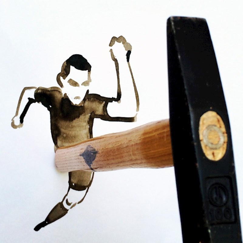 On koristi svakodnevne predmete koje nadopunjava svojim crtežima i tako stvara simpatična i duhovita umjetnička djela.