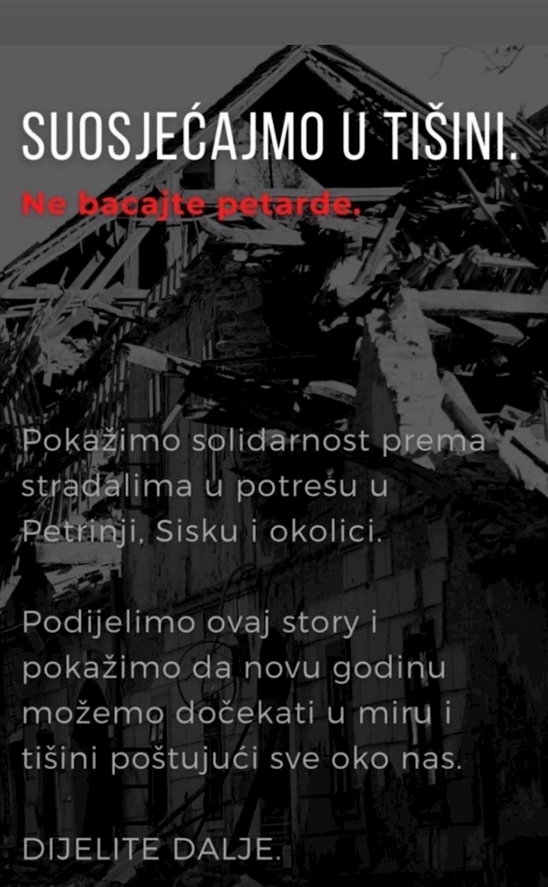 Ipak, brojni građani i udruge apeliraju na sve stanovnike Hrvatske da se večeras suzdrže od upotrebe pirotehnike. Iz Prijatelja životinja tako poručuju: "Ova godina svima nam je iznimno teška, a nakon potresa u Zagrebu u ožujku godina završava još gorim stradanjima ljudi i s još većim brojem žrtava. Molimo sve da pokažu barem minimum suosjećanja prema ljudima koji su na bilo koji način stradali ove godine i da ne stvaraju svima dodatni stres i strah ispucavanjem pirotehnike. Ako želimo nešto slaviti, onda proslavimo mirno ljudsku solidarnost u ovim teškim vremenima".