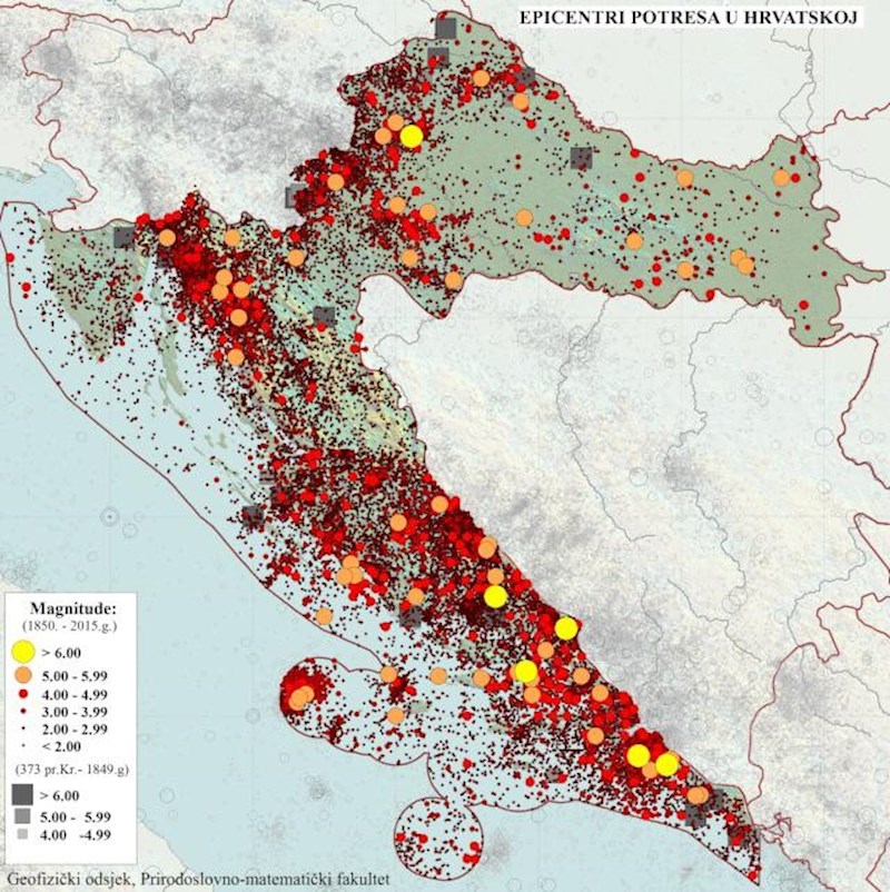 Na mapi koju je izradio Geofizički odsjek Prirodoslovno-matematičkog fakulteta u Zagrebu vidljivi su svi potresi zabilježeni u Hrvatskoj od početka mjerenja 1850. godine pa sve do 2015. godine.