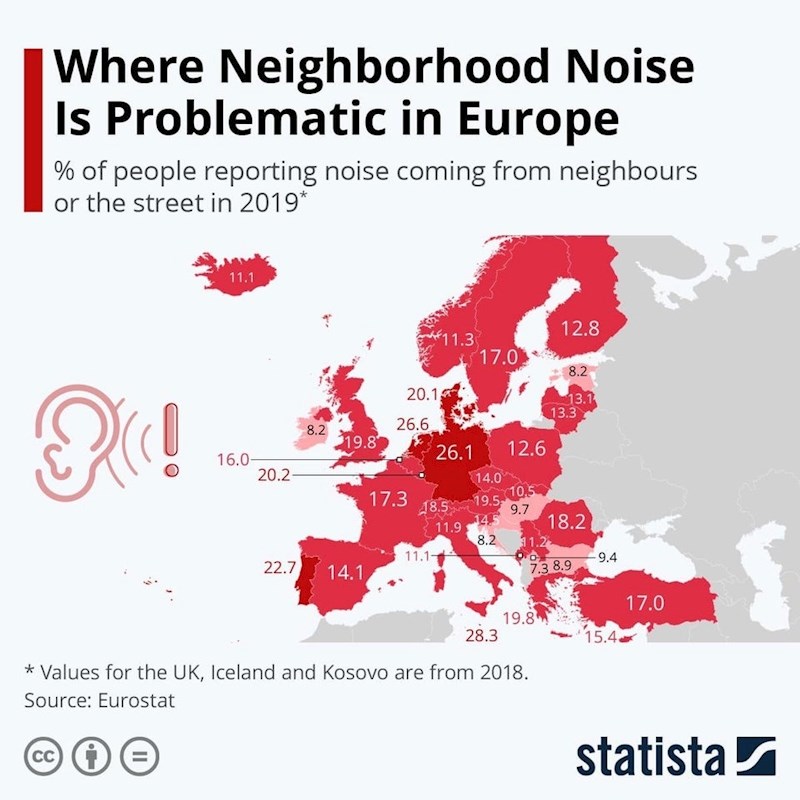 Na slici se nalazi jako zanimljiva mapa Europa koju je objavila ugledna stranica Statista. Na njoj je vidljiv postotak građana u svakoj zemlji koji su se žalili na buku susjeda ili s ulice u 2019. godini.