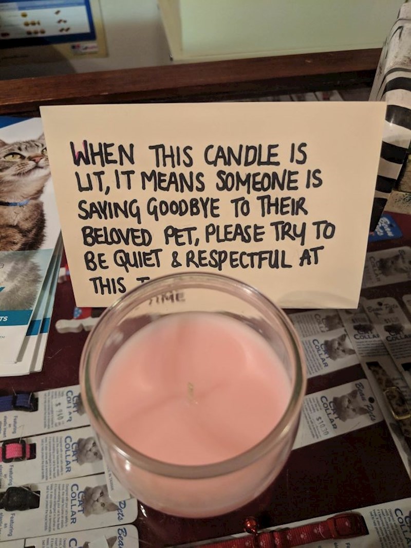 Ova svijeća nalazi se u čekaonici kod jednog veterinara. Namjena joj je da osobe koje čekaju red i vide da je svijeća upaljena znaju da se unutra netko oprašta od svog ljubimca. Da budu strpljive i diskretne kako ne bi ometale takav tužan trenutak. Divna ideja da se ljudima i ljubimcima omogući dostojanstven oproštaj bez da netko stalno kuca na vrata i viče što se čeka.