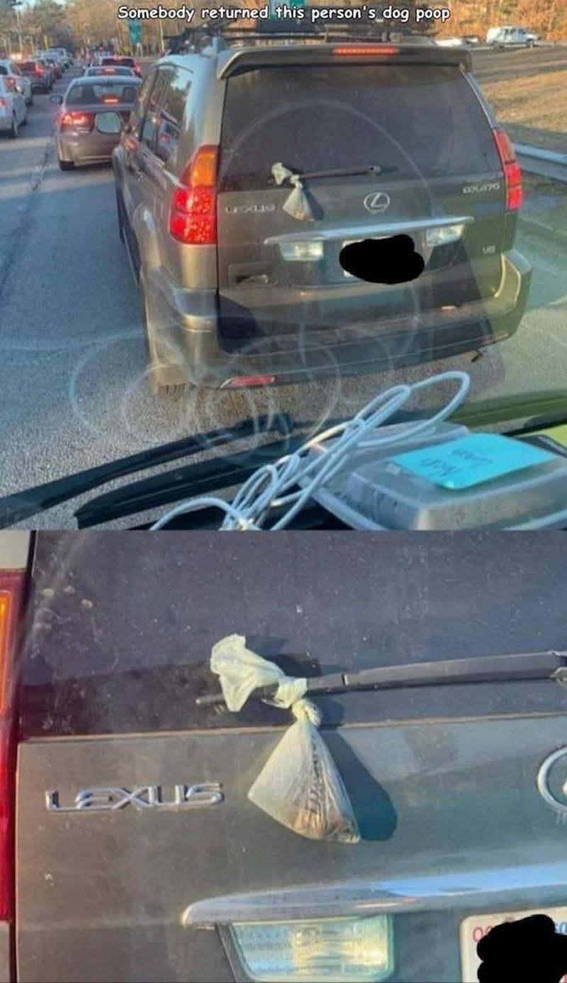 U automobilu je čovjek koji je netom prije bio u parku s psom i, iako je upozoren, odbio je počistiti za njim nakon što je obavio nuždu. Neki pravednik iz parka očistio je umjesto njega, sadržaj ubacio u kesicu, a kesicu okačio o brisač. Pravda: servirana.