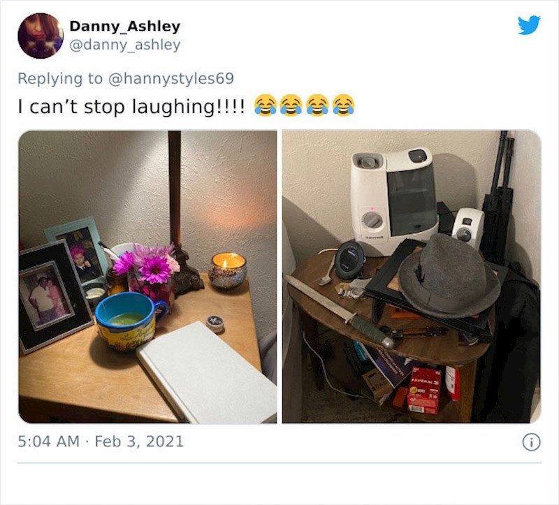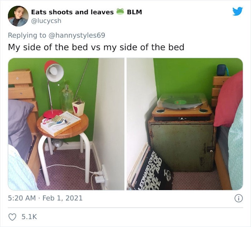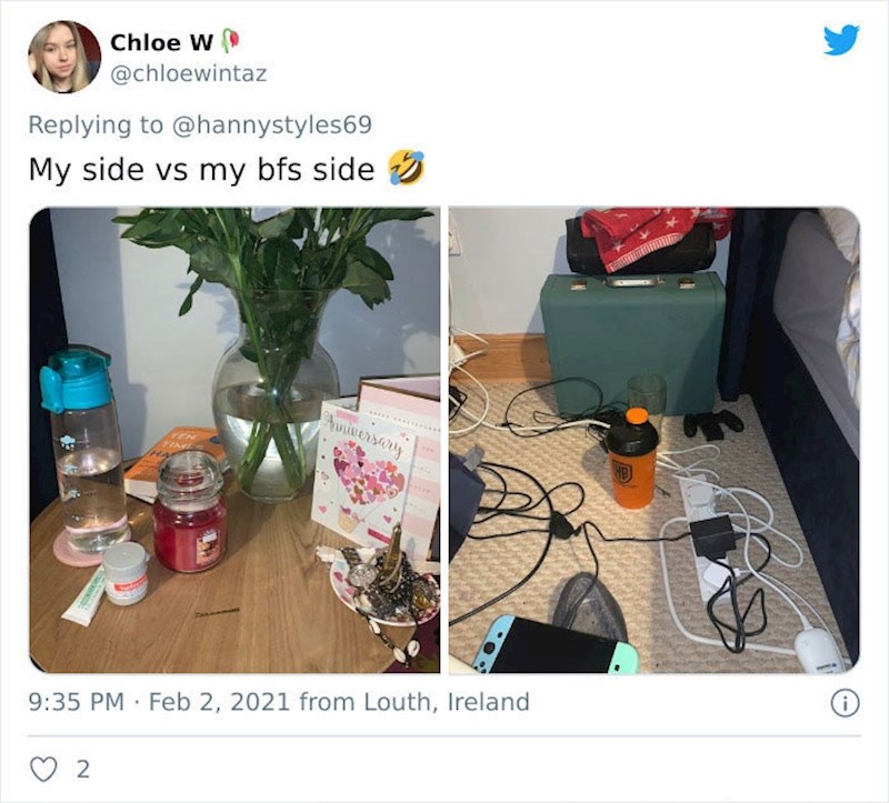 Trend je pokrenula jedna korisnica Twittera koja je prva objavila usporedbu svojeg noćnog ormarića i onog od svog muža. Objava je postala viralna, a mnoge djevojke i žene sada šalju svoje dokaze teškog života s muškarcima.