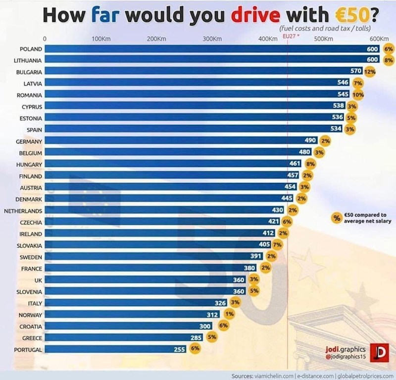 Netko je napravio graf koji pokazuje koliko km u svakoj državi možete prijeći za 50 eura
