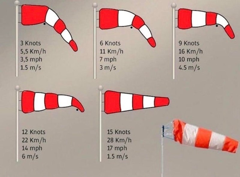 Jeste li znali da uz pomoć vjetrokaza i sami možete "pročitati" kojom brzinom vjetar puše? Kraj vjetrokaza je dio koji pruža najviše otpora i nalazi se na onoj strani koja je okrenuta u smjeru u kojem vjetar puše. Kada je taj dio također uspravan onda vjetar puše brzinom od 28 kilometara na sat. Na slici dolje možete vidjeti brzinu kojom puše vjetar za svaku od traka vjetrokaza.