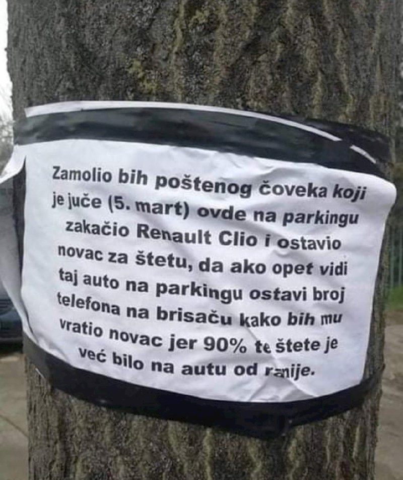 Sutradan je na stablu osvanula poruka: Vlasnik automobila traži čovjeka koji mu je oštetio automobil da mu vrati novac. Razlog? Automobil je već prije bio oštećen.