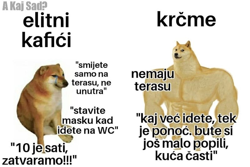 Ponovno otvaranje kafića i dalje je jedna od top tema u Hrvatskoj, a posljednjih dana jako se počeo širiti meme koji objašnjava razliku između elitnog kafića i "obične" krčme.
